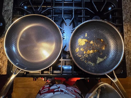Titanio X a la izquierda, imitación de 70 euros a la derecha. Hice hamburguesas con ambas y las lavé con agua. Todo se desprendió antes incluso de limpiarlas con jabón. Los filetes más bonitos que he hecho nunca salieron de esta sartén. Cocina de forma más uniforme y no necesita un fuego muy alto. Tiene una superficie grande y agradable, y parece muy bien fabricada. Quiero cocinar 20 veces al día solo para poder limpiar esta estúpida cosa una y otra vez, es fantástica.