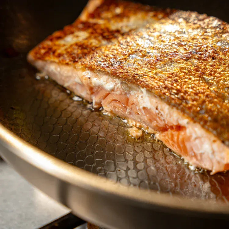El titanio suena sofisticado, pero lo importante en la cocina no son los metales, sino los resultados. El titanio es más ligero, sí. La cerámica puede astillarse. El acero inoxidable puede durar para siempre—si está bien diseñado. Nuestra sartén es híbrida: diseñada con capas para control de calor, resistencia a rayaduras y un rendimiento libre de toxinas. Obtienes el sellado del acero con la facilidad de lo antiadherente. Esa es la diferencia que importa.